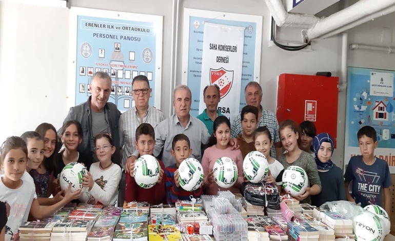 Bursa futbolunun oynanmasında çok büyük emekleri olan ve bütün iş yükünü çekenlerin başında gelen Türkiye Saha Komiserleri Derneği Bursa Şubesi sosyal sorumluluk projelerine devam ediyor. “Bir kitap bin umut” projesi adı altında Orhaneli ilçesinin Erenler Köyü’ne giden Bursalı komiserler Erenler Köyü İlk ve Ortaokulu’na 690 adet kitap, 100 adet kalem kutusu, çeşitli kırtasiye malzemesi ve 10 adet futbol topu hediye etti. KOnuyla ilgili açıklamalarda bulunan Türkiye Saha Komiserleri Derneği Bursa Şubesi Başkanı Ercan Ütücü, “Bursa futbolunda görev alan komiser arkadaşlarımız ile sosyal sorumluluk projeleri düzenlemeye devam ediyoruz. Erenler Köyü İlk ve Ortaokulu müdürümüz Özkan Sevim bey ile görüştük bazı ihtiyaçlarını karşıladığımız için çok mutluyuz. Bursa’da böyle ihtiyacı olan okullarımıza yardım etmeye devam edeceğiz” dedi.