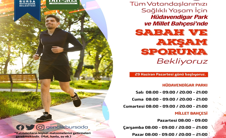 Bursa Büyükşehir Belediyesi Gençlik ve Spor Hizmetleri Şube Müdürlüğü tarafından düzenlenen sabah ve akşam sporu etkinlikleri yeni normal düzende Hüdavendigar Parkı ve Millet Bahçesinde bugün başlıyor. Sabah ve akşam sporu etkinlikleri ile gündelik hayatın rutinine, sporla, sağlıklı bir mola vermek isteyen Bursalılar, Hüdavendigar Kent Parkı ve Bursa Millet Bahçesinde hafta içi ve hafta sonu belirlenen gün ve saatte uzman eğitmen eşliğinde ücretsiz spor yapma imkanına kavuşacak. Dünyayı etkisi altına alan Kovid-19 salgını ile tüm dünyada olduğu gibi Türkiye'de de bir süre evlerinde kalmak zorunda kalan vatandaşlar yeni normal süreçte sosyal mesafe kurallarına uymak kaydıyla sağlıklı bir yaşam için bugünden itibaren “Sabah ve Akşam Sporu” etkinliğine katılabilecek.